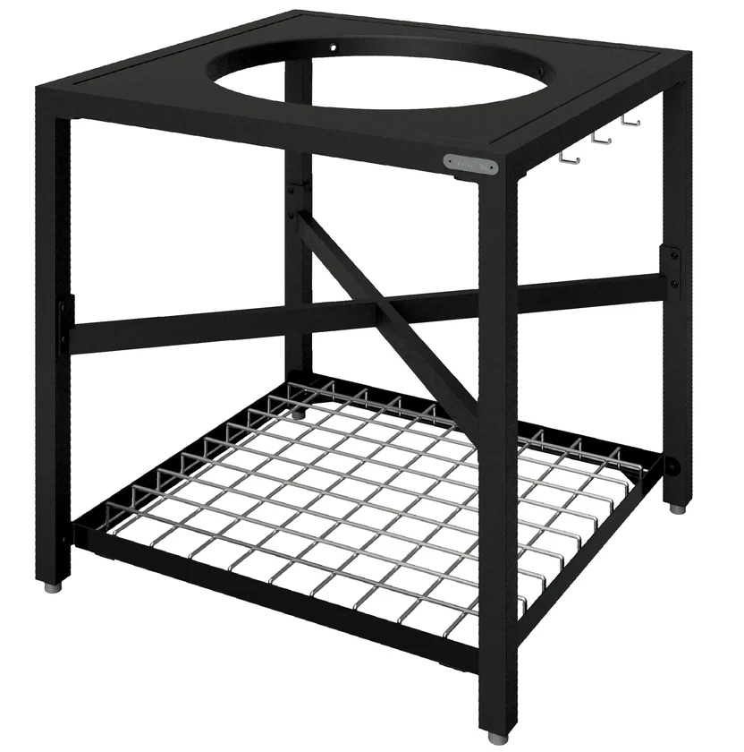 Stalowo-aluminiowy stelaż do Big Green Egg to solidna podstawa do budowania własnej kuchni ogrodowej. Aluminiowe nogi i górna rama nie rdzewieją nawet po zarysowaniu powłoki. Dolna rama i belki poprzeczne wykonane ze stali zapewniają dodatkową wytrzymałość konstrukcji. W zestawie znajduje się stalowy wkład siatkowy, haczyki na narzędzia i cztery nóżki poziomujące — niezbędne przy ustawianiu na nierównej nawierzchni. Nogi przystosowane są również do montażu kółek z zestawu Caster Kit.- Aluminium i stal malowana proszkowo — trwała i odporna na rdzę nawet po zarysowaniu