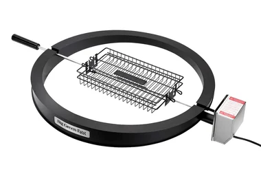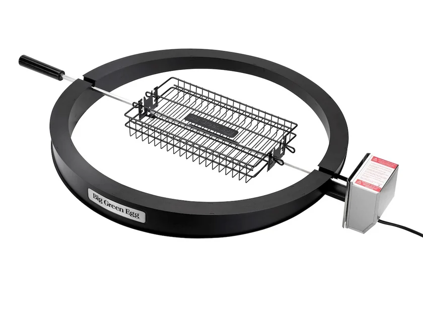 Rotisserie Big Green Egg to rożen przeznaczony do pieczenia mięsa, drobiu i warzyw w powolnym obrocie nad żarzącym się węglem. Ciągły ruch rożna sprawia, że wytapiający się tłuszcz nieustannie oblewa składniki, nadając im wyjątkowy aromat i równomiernie złotobrązowy kolor.