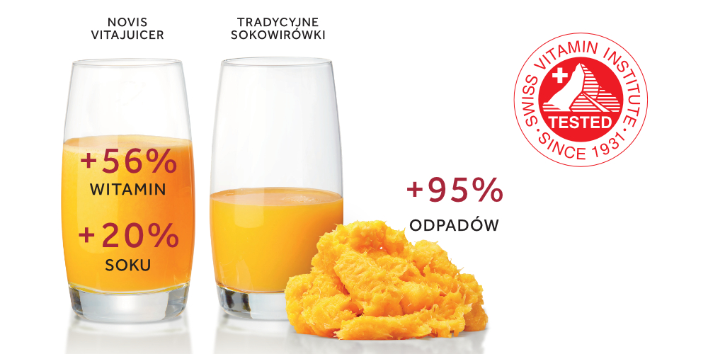 ✓Naukowo potwierdzona skuteczność - Niezależne testy Swiss Vitamin Institute potwierdziły 56% wyższą zawartość witamin w porównaniu do wyciskarek ślimakowych