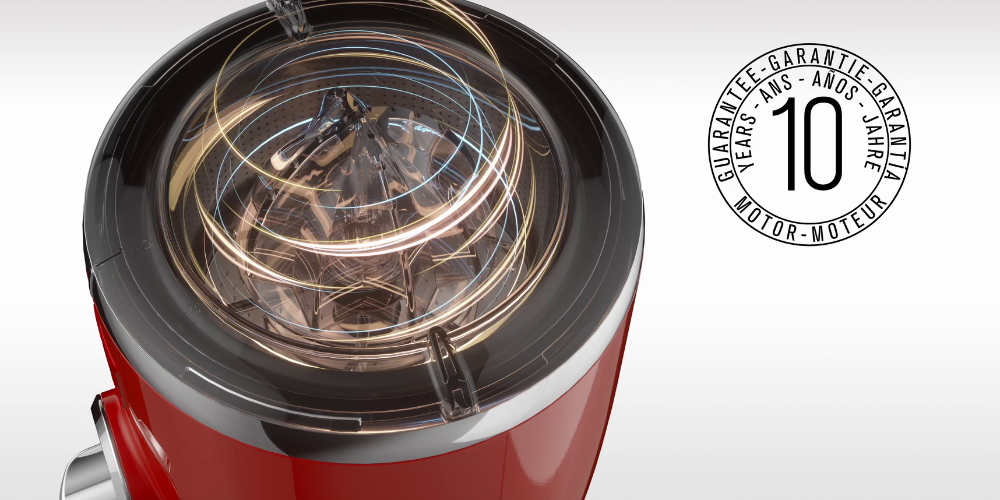 Inteligentny silnik prądu stałego o mocy 240W z systemem AutoSpeed automatycznie reguluje obroty w zależności od twardości produktów, zapewniając optymalną pracę bez przegrzewania. Wyjątkowo cicha praca na poziomie 56 dB pozwala na komfortowe użytkowanie.