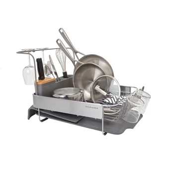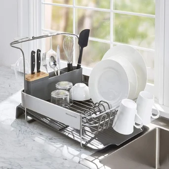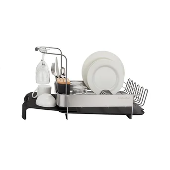Suszarka do naczyń z serii KitchenAid Sinkware to elegancki i funkcjonalny dodatek do każdej kuchni. Dzięki niej utrzymanie porządku w strefie wokół zlewu jest łatwiejsze, a rozsuwany ociekacz o maksymalnych wymiarach 36 x 78 cm zapewnia przestrzeń do suszenia 11 talerzy, 6 filiżanek i 4 szklanek. Ponadto suszarkę wyposażono w wyjmowany pojemnik na sztućce, bambusowy blok do suszenia noży i wygodnyy wieszak-reling na 2 do 4 kieliszków. Dodatkowe przydatne rozwiązania to antypoślizgowe nóżki oraz kątowy ociekacz kierujący wodę prosto do zlewu. Produkt nie nadaje się do mycia w zmywarce.