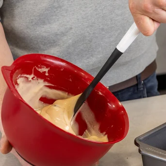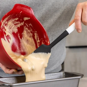 Szpatuła kuchenna z silikonową, elastyczną, skośną końcówką pozwala dotrzeć do trudno dostępnych zakamarków misek, słoików i innych naczyń. Przydatna także przy rozprowadzeniu kremów i mas oraz obracaniu produktów podczas smażenia. Silikonowa część odporna na temperatury do 250°C. Bezpieczna dla naczyń z powłokami nieprzywierającymi. Można myć w zmywarce.