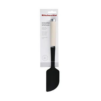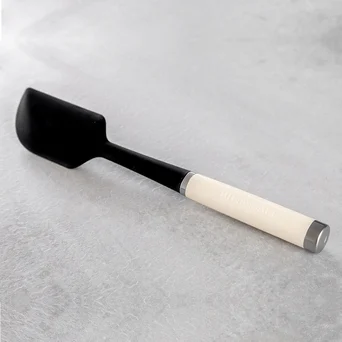 Szpatuła kuchenna z silikonową, elastyczną, skośną końcówką pozwala dotrzeć do trudno dostępnych zakamarków misek, słoików i innych naczyń. Przydatna także przy rozprowadzeniu kremów i mas oraz obracaniu produktów podczas smażenia. Silikonowa część odporna na temperatury do 250°C. Bezpieczna dla naczyń z powłokami nieprzywierającymi. Można myć w zmywarce.