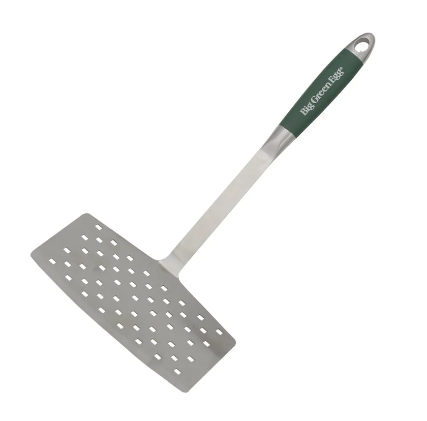 Szpatuła (Wide Spatula) wykonana jest ze stali nierdzewnej. Zaprojektowana z myślą o bezpiecznym przekładaniu większych kawałków mięsa, ryb i warzyw na kamado. Szeroka powierzchnia zapewnia stabilne podparcie składników i pełną kontrolę podczas grillowania.