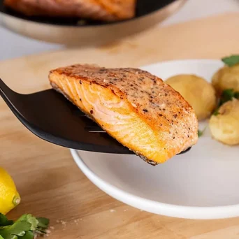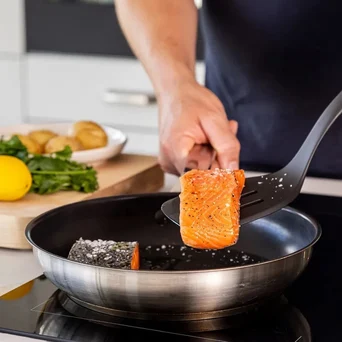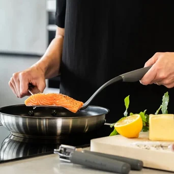 Szpatuła z otworami przydatna podczas smażenia, obracania i nakładania potraw. Odporna na temperaturę do 232°C. Bezpieczna dla naczyń z powłokami nieprzywierającymi. Można myć w zmywarce. Podczas smażenia nie pozostawiać w patelni.