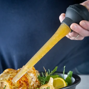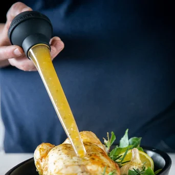 Szpryca do marynat Universal idealnie sprawdzi się podczas pieczenia i marynowania mięs. Czytelna podziałka umożliwa precyzyjne dozowanie sosów, marynat lub tłuszczu wytopionego podczas pieczenia. Tworzywo jest odporne na wysokie temperatury i nadaje się do mycia w zmywarce.