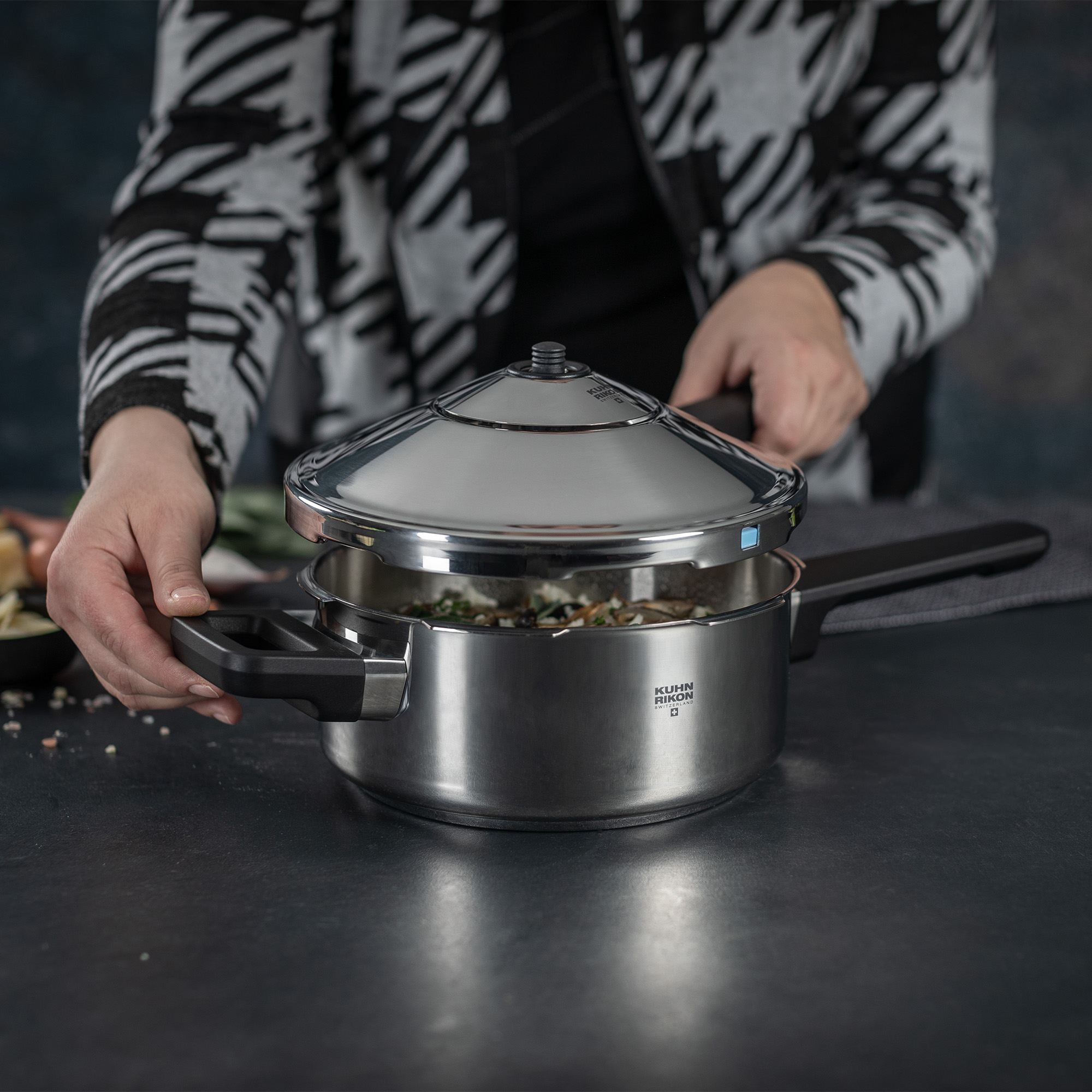 Korpus wykonany ze stali nierdzewnej najwyższej jakości zapewnia odporność na korozję i długotrwałą estetykę. Innowacyjne dno Superthermic z wielowarstwową konstrukcją typu sandwich równomiernie rozprowadza i optymalnie magazynuje ciepło, zapewniając maksymalną efektywność energetyczną. Urządzenie jest kompatybilne ze wszystkimi rodzajami kuchenek, w tym indukcyjnymi.