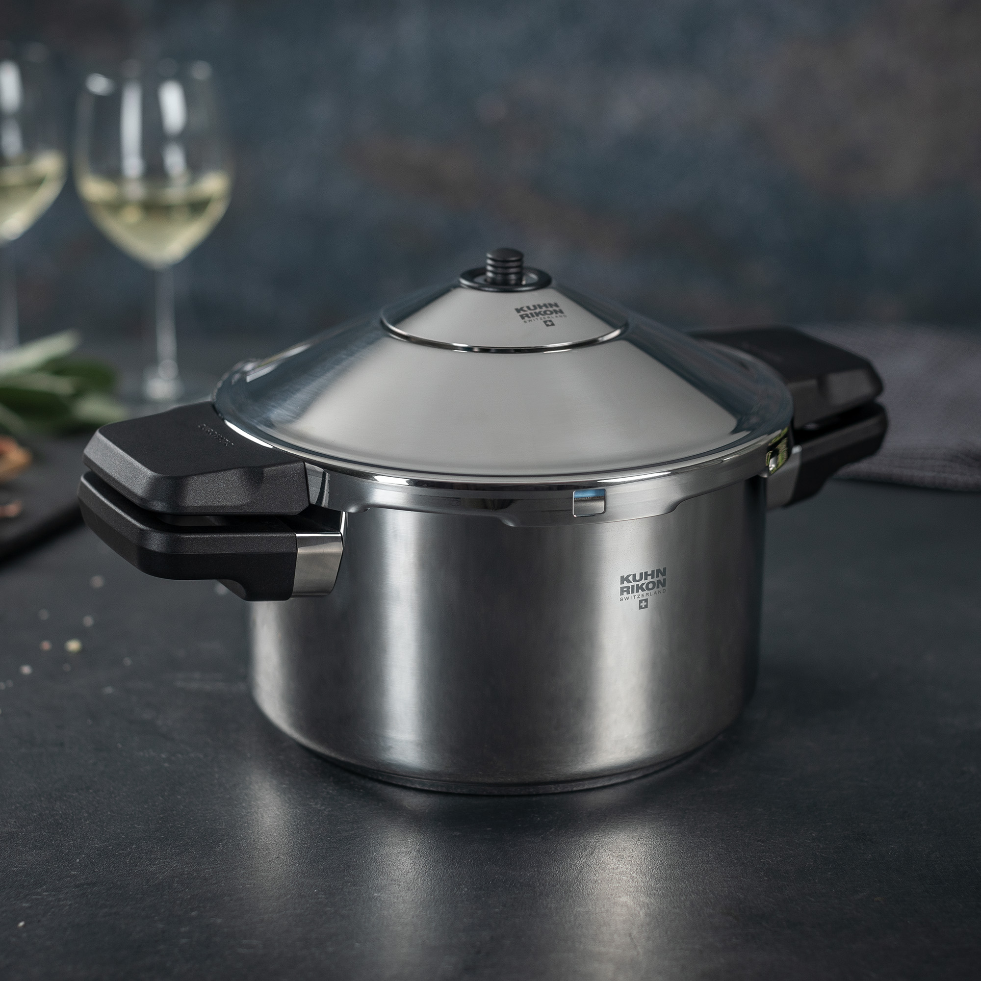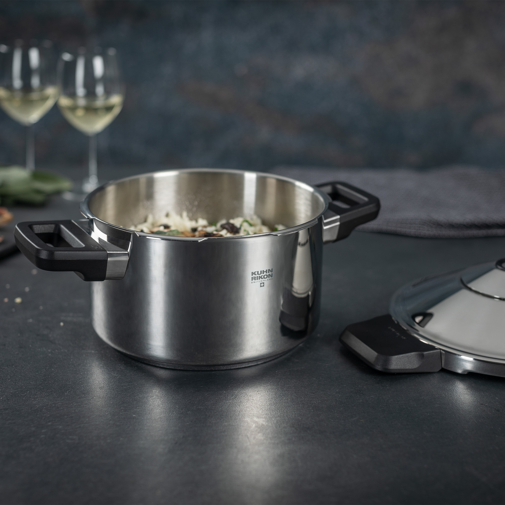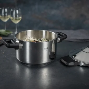 Korpus wykonany ze stali nierdzewnej najwyższej jakości zapewnia odporność na korozję i długotrwałą estetykę. Innowacyjne dno Superthermic z wielowarstwową konstrukcją typu sandwich równomiernie rozprowadza i optymalnie magazynuje ciepło, zapewniając maksymalną efektywność energetyczną. Urządzenie jest kompatybilne ze wszystkimi rodzajami kuchenek, w tym indukcyjnymi.