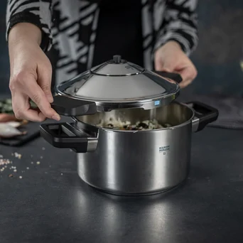 Krótszy czas ekspozycji składników odżywczych na wysoką temperaturę skutkuje znaczącym zachowaniem witamin i minerałów. Badania przeprowadzone przez SQTS (Swiss Quality Testing Services) wykazały, że gotowanie w szybkowarze pozwala zachować dużu więcej witaminy C w porównaniu z tradycyjnymi metodami. Wkład sitowy w dnie urządzenia dodatkowo separuje produkty od wody, intensyfikując efekt ochrony cennych składników odżywczych i wspierając zdrową dietę.