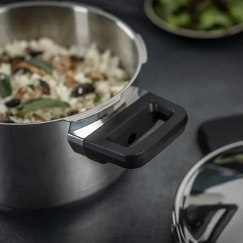 Szybkowar o średnicy 20cm posiada dwa krótkie uchwyty po bokach w celu wygodniejszego operowania naczyniem.