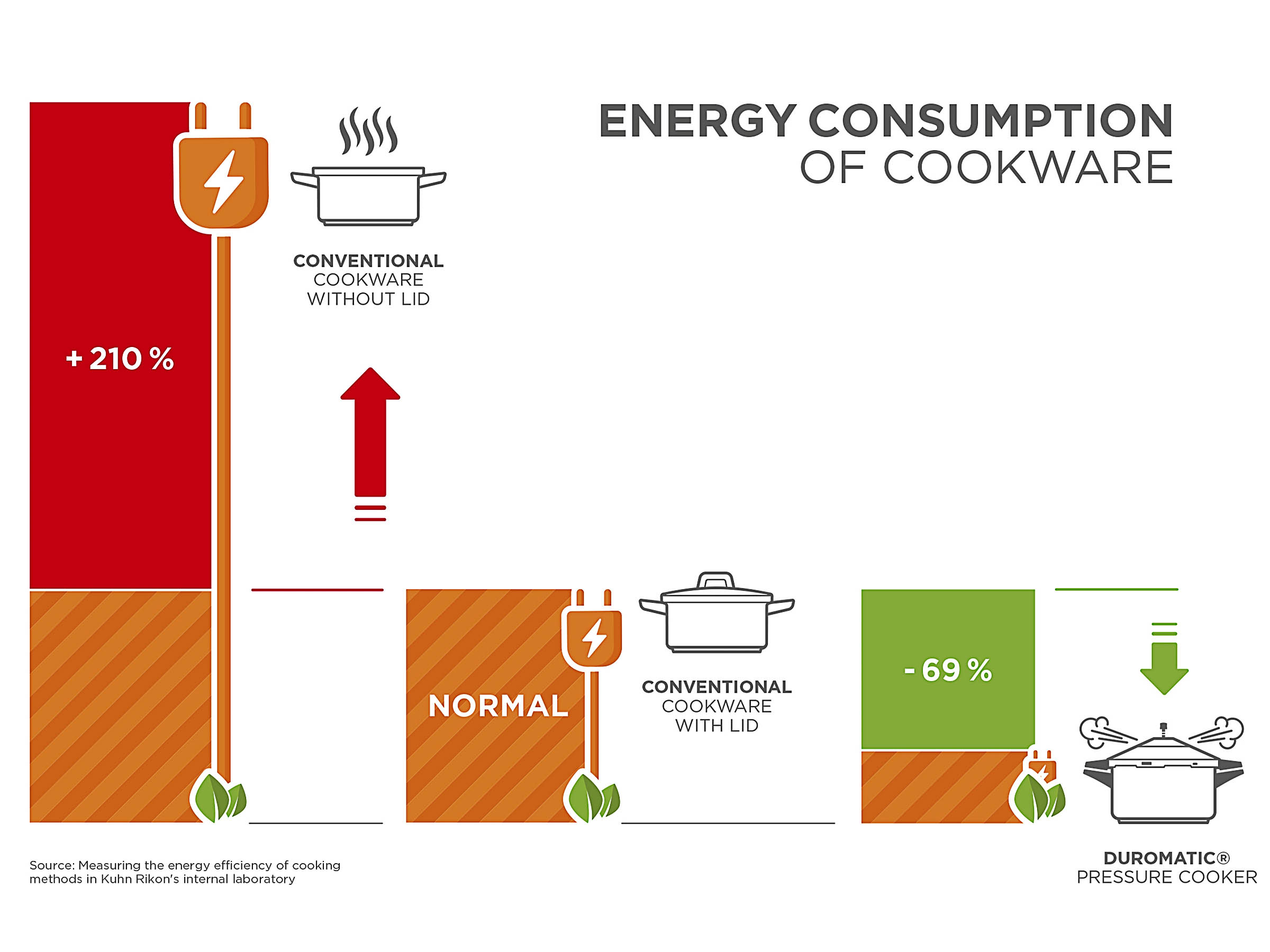 Duromatic zużywa o 69% mniej energii w porównaniu z gotowaniem w zwykłych naczyniach z pokrywką. W przypadku gotowania bez pokrywki różnica sięga aż 279%. Niższe zużycie energii przekłada się nie tylko na mniejsze rachunki za prąd, ale przede wszystkim na realny wkład w ochronę środowiska naturalnego.
