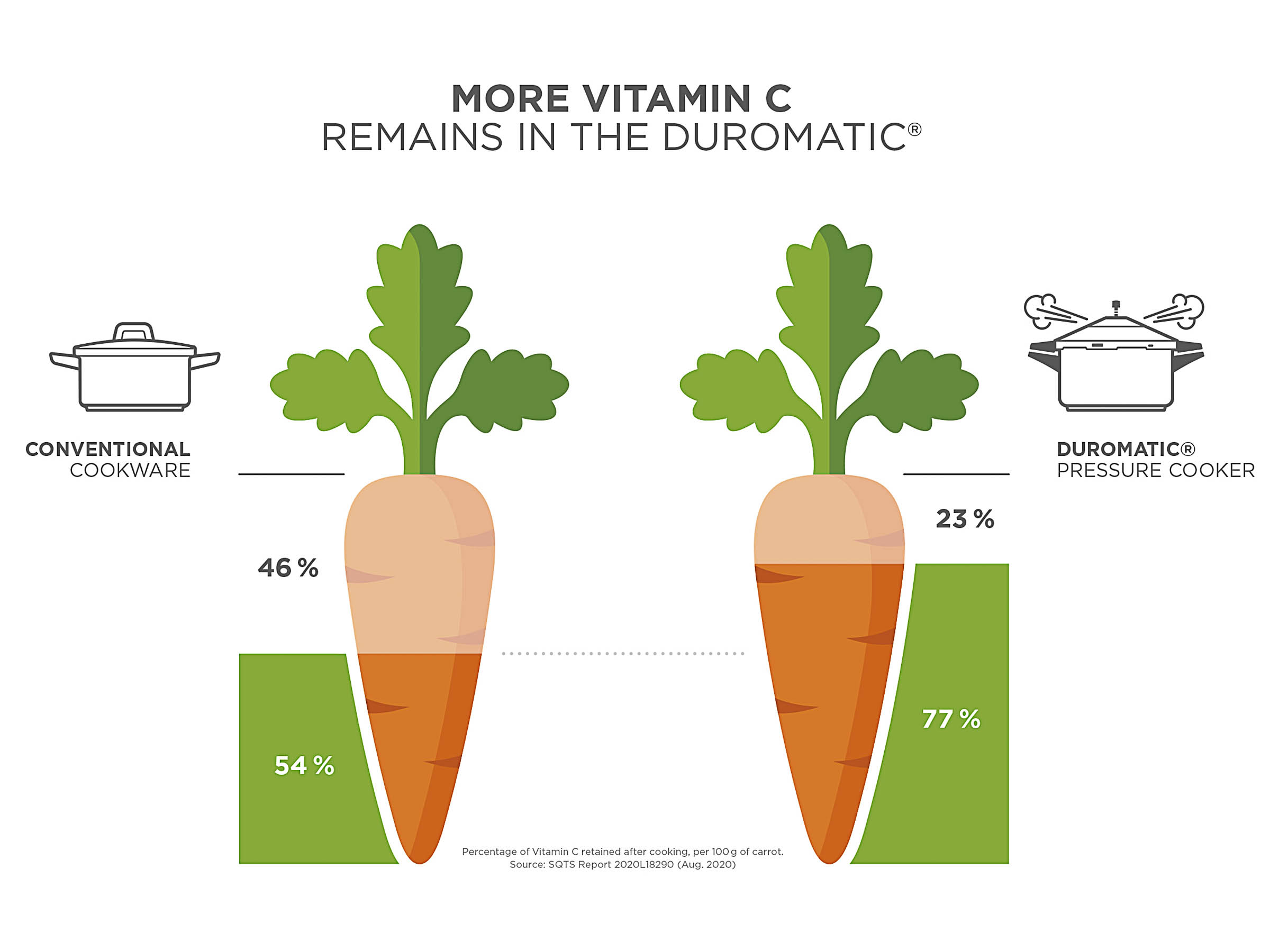 Krótszy czas ekspozycji składników odżywczych na wysoką temperaturę skutkuje znaczącym zachowaniem witamin i minerałów. Badania przeprowadzone przez SQTS (Swiss Quality Testing Services) wykazały, że gotowanie w szybkowarze pozwala zachować dużu więcej witaminy C w porównaniu z tradycyjnymi metodami. Wkład sitowy w dnie urządzenia dodatkowo separuje produkty od wody, intensyfikując efekt ochrony cennych składników odżywczych i wspierając zdrową dietę.