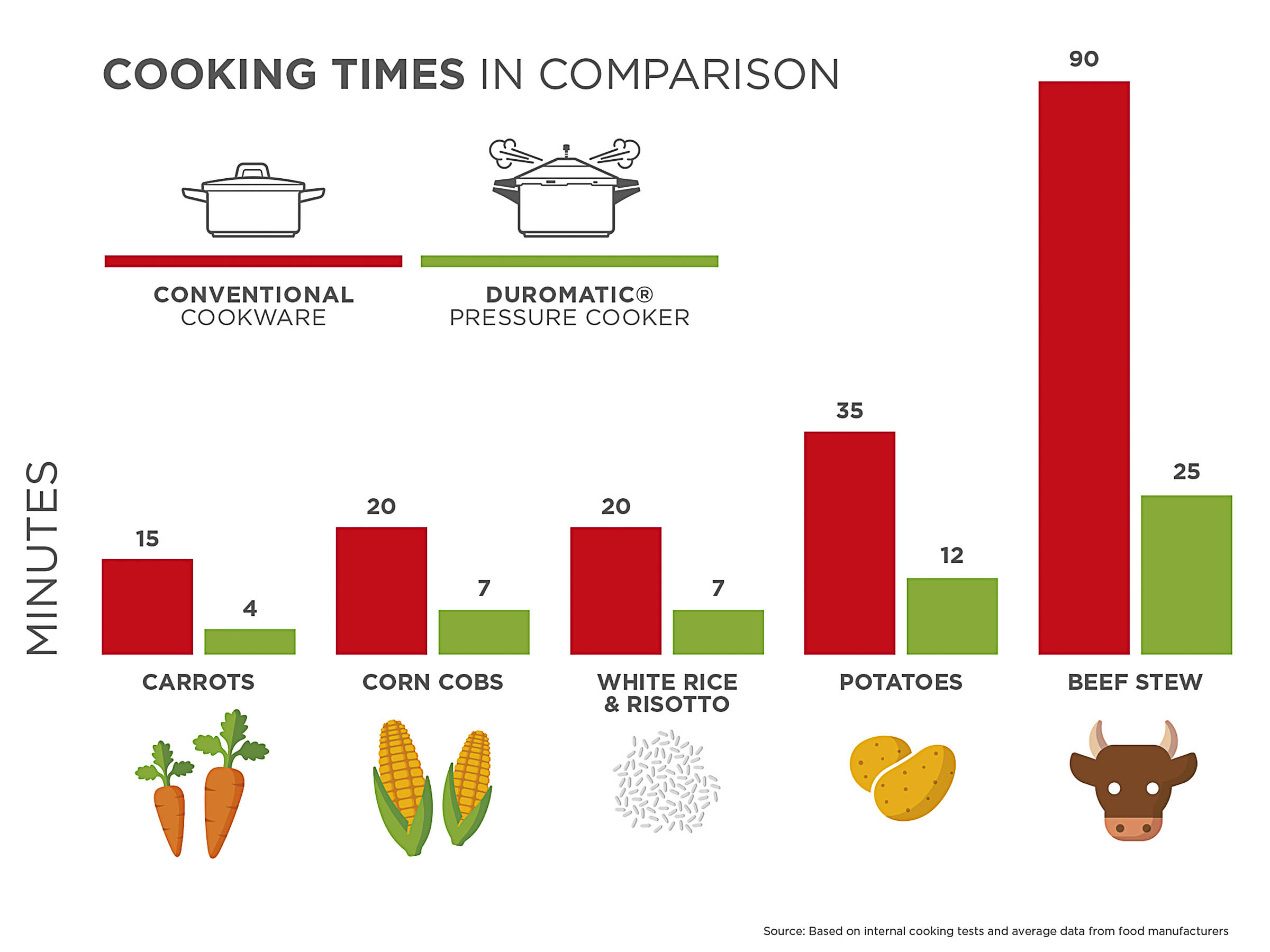 Gotowanie w szybkowarze Duromatic pozwala zaoszczędzić do 70% czasu w porównaniu z konwencjonalnymi naczyniami. Marchewka, która tradycyjnie wymaga 15 minut obróbki termicznej, w Duromatic jest gotowa w zaledwie 4 minuty. Znaczące skrócenie czasu gotowania przekłada się na większą wygodę codziennego użytkowania oraz możliwość przygotowania zdrowych posiłków nawet przy napiętym harmonogramie dnia.