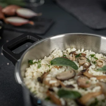 Korpus wykonany ze stali nierdzewnej najwyższej jakości zapewnia odporność na korozję i długotrwałą estetykę. Innowacyjne dno Superthermic z wielowarstwową konstrukcją typu sandwich równomiernie rozprowadza i optymalnie magazynuje ciepło, zapewniając maksymalną efektywność energetyczną. Urządzenie jest kompatybilne ze wszystkimi rodzajami kuchenek, w tym indukcyjnymi.