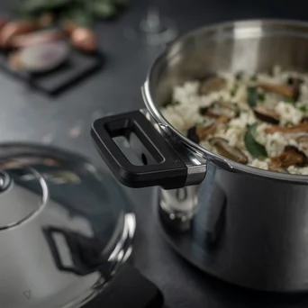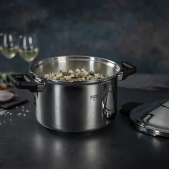 Korpus wykonany ze stali nierdzewnej najwyższej jakości zapewnia odporność na korozję i długotrwałą estetykę. Innowacyjne dno Superthermic z wielowarstwową konstrukcją typu sandwich równomiernie rozprowadza i optymalnie magazynuje ciepło, zapewniając maksymalną efektywność energetyczną. Urządzenie jest kompatybilne ze wszystkimi rodzajami kuchenek, w tym indukcyjnymi.