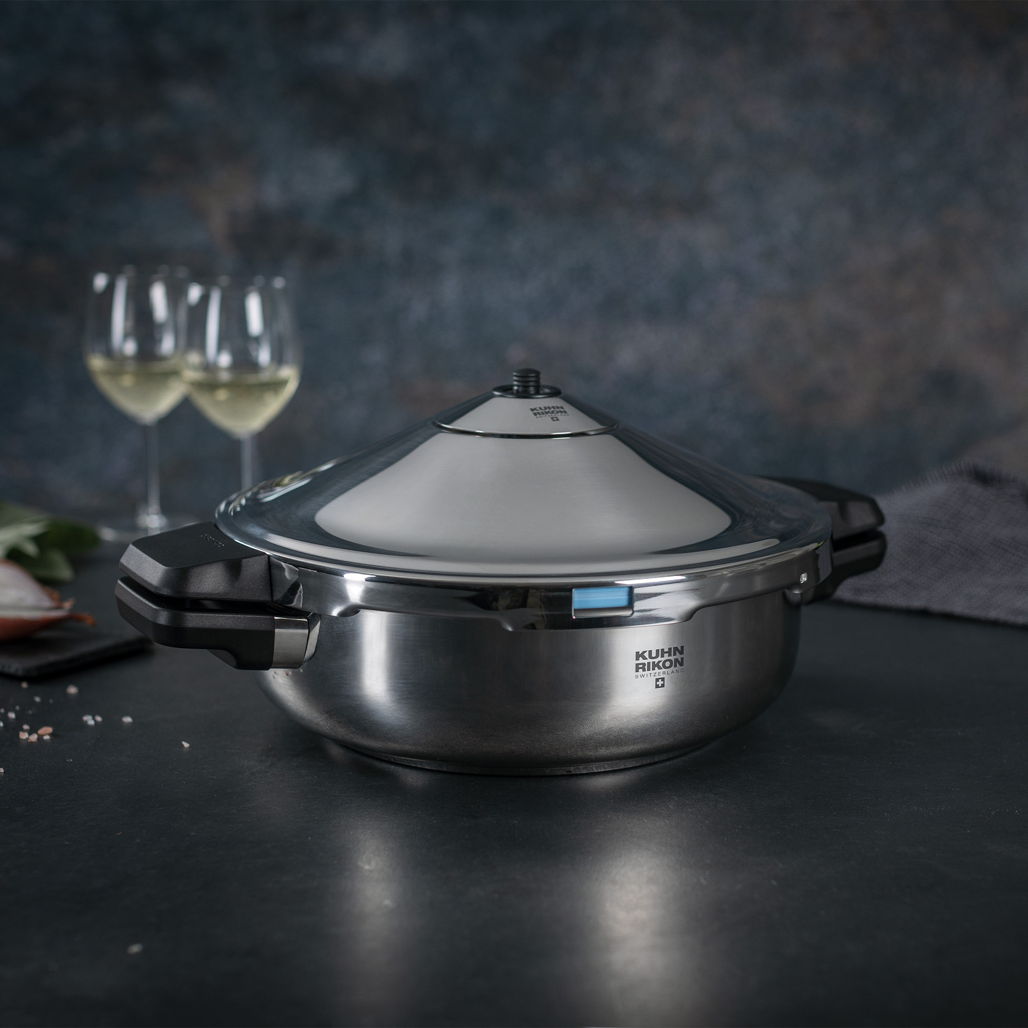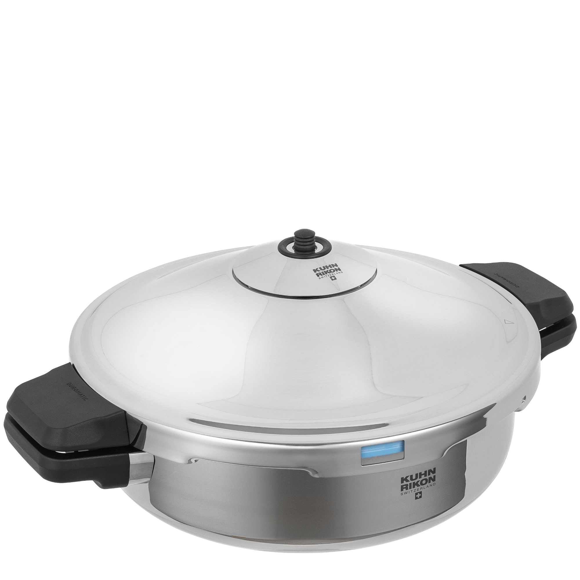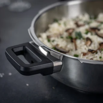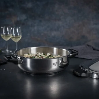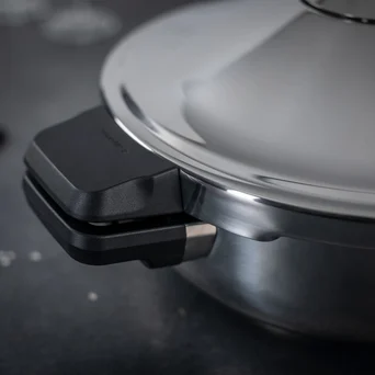Korpus wykonany ze stali nierdzewnej najwyższej jakości zapewnia odporność na korozję i długotrwałą estetykę. Innowacyjne dno Superthermic z wielowarstwową konstrukcją typu sandwich równomiernie rozprowadza i optymalnie magazynuje ciepło, zapewniając maksymalną efektywność energetyczną. Urządzenie jest kompatybilne ze wszystkimi rodzajami kuchenek, w tym indukcyjnymi.
