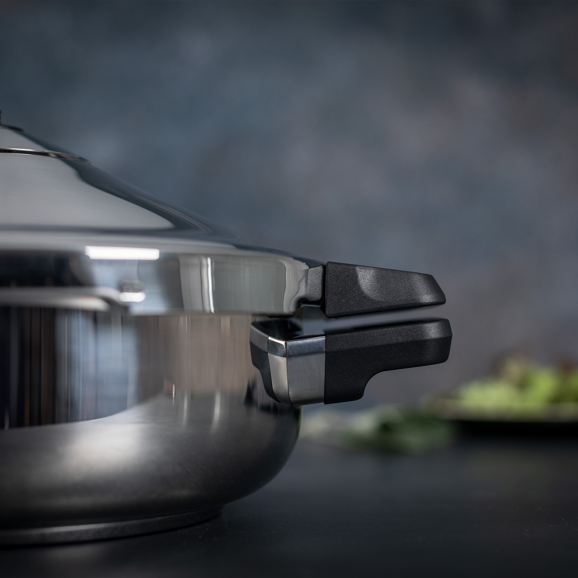 Szybkowar-patelnia o średnicy 28cm posiada dwa krótkie uchwyty po bokach w celu wygodniejszego operowania naczyniem.