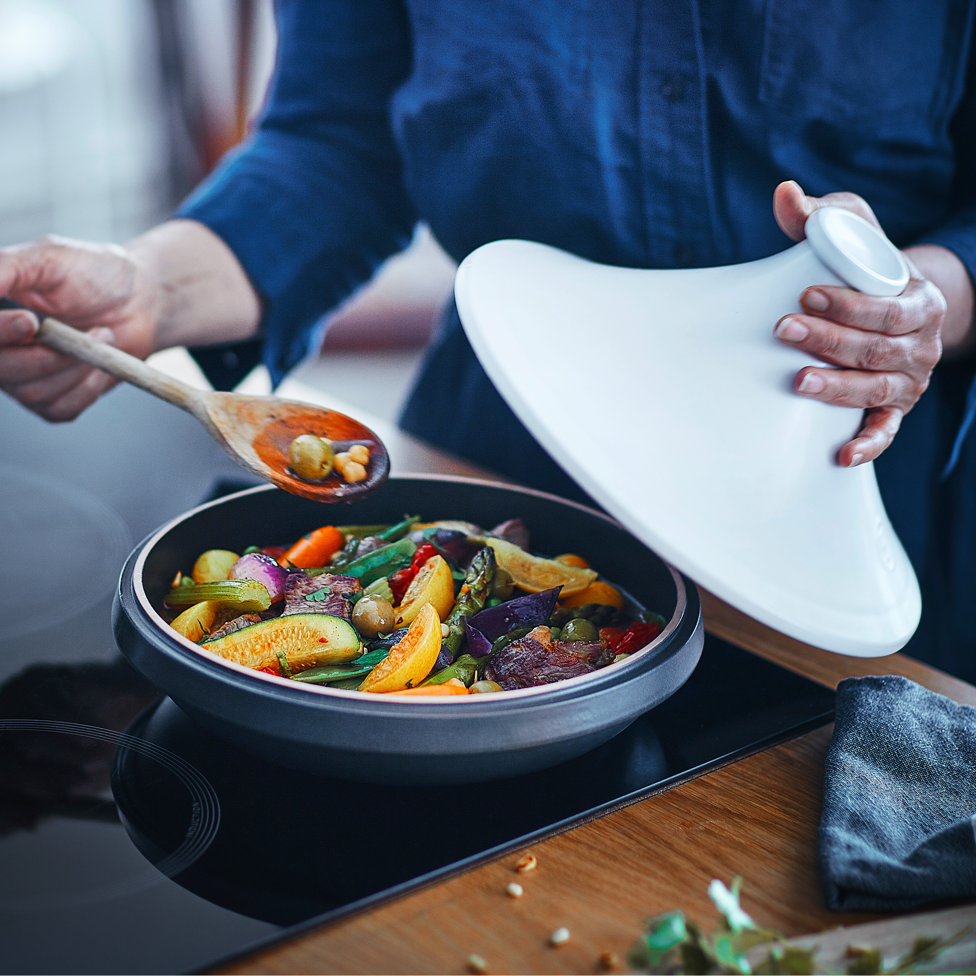 Tagine Delight 26cm to wyjątkowe naczynie kuchenne, które pozwala na przygotowywanie aromatycznych dań inspirowanych kuchnią północnoafrykańską oraz tradycyjnych duszonych potraw. Dzięki zaawansowanej technologii ceramicznej można w nim gotować na wszystkich rodzajach kuchenek, w tym płytach indukcyjnych i w piekarniku.