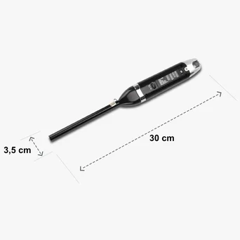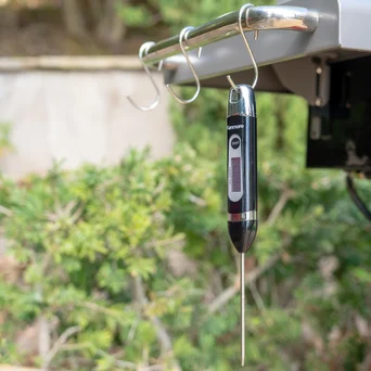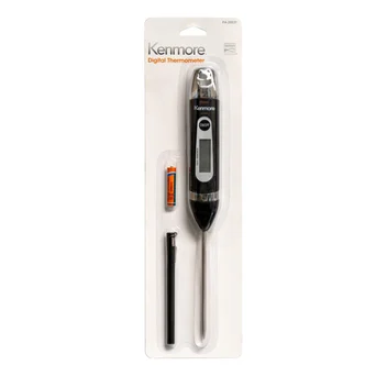 Cyfrowy termometr marki Kenmore z sondą i skuwką zabezpieczającą to niezbędne narzędzie każdego prawdziwego fana grillowanych steków i burgerów. Pozwala na precyzyjne i szybkie monitorowanie temperatury potraw przyrządzanych na grillu, a także podczas pieczenia i gotowania. Ekran LCD zapewnia dokładne odczyty temperatury, a ucho na końcu obudowy pozwala zawiesić termometr na haczyku przy grillu lub kuchennym relingu. Możliwość zmiany jednostek pomiaru (ºC/ºF) za pomocą przycisku z tyłu korpusu.