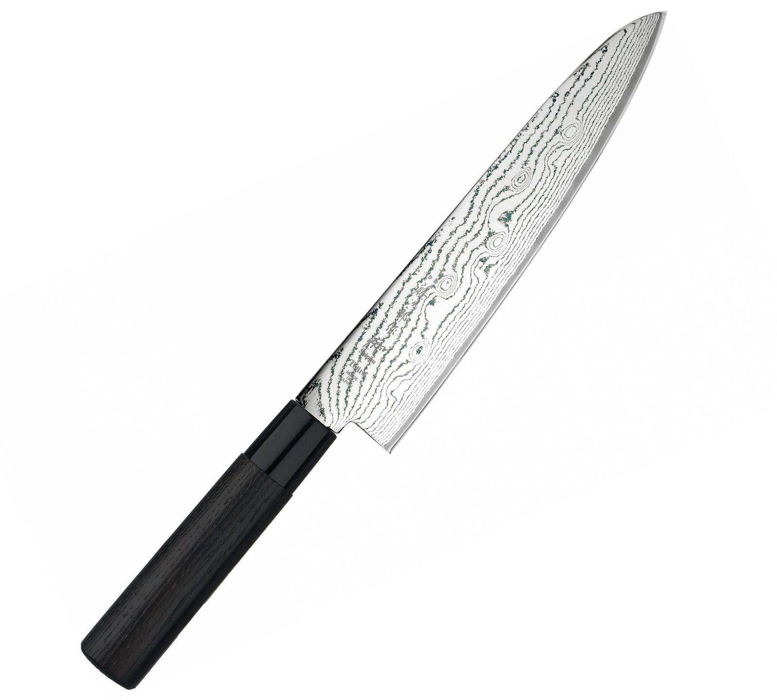 Rdzeń ze stali VG10, okuty stalą nierdzewną 13-chromową, zapewnia profesjonalną ostrość. Czarna obróbka powierzchni zwiększa odporność na korozję. Rękojeść z drewna kasztanowca zapewnia pewny chwyt.