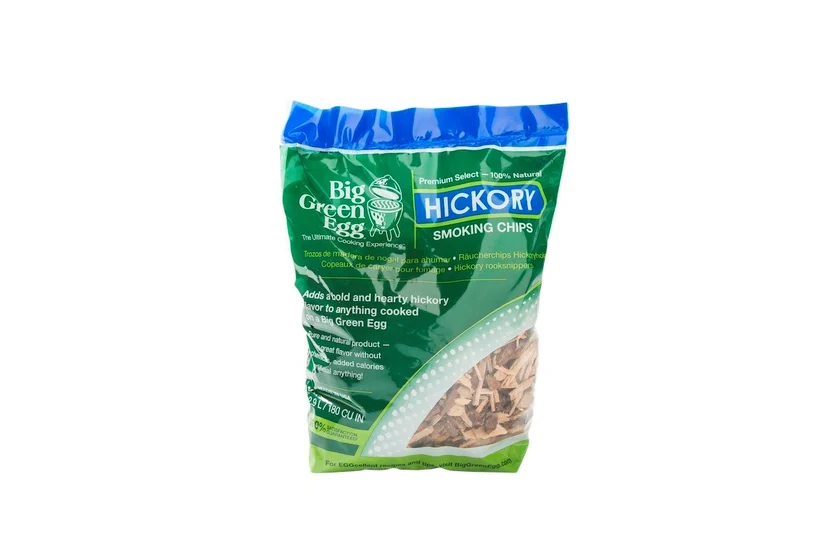 Wood Chips Big Green Egg – wiórki do wędzenia w 5 smakach: Hickory, Pecan, Apple, Cherry, Oak. Idealne do krótkich sesji wędzenia ryb, drobiu i mięsa na kamado.