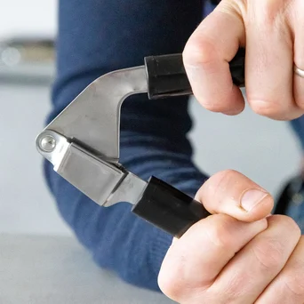 Klasyczny wyciskacz do czosnku z dużą komorą na kilka ząbków. Wygodny uchwyt neutralizuje nacisk dłoni, dzięki temu wyciskanie nie wymaga wysiłku. Wyjmowane sitko umożliwia dokładne wyczyszczenie po użyciu. Można myć w zmywarce.