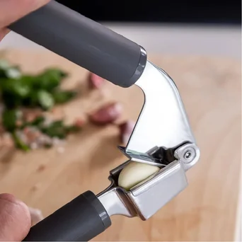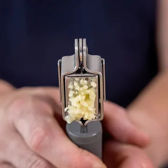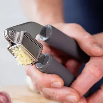 Klasyczny wyciskacz do czosnku z dużą komorą na kilka ząbków. Wygodny uchwyt neutralizuje nacisk dłoni, dzięki temu wyciskanie nie wymaga wysiłku. Wyjmowane sitko umożliwia dokładne wyczyszczenie po użyciu. Można myć w zmywarce.