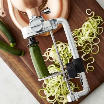 Ostrze wykrawa ze świeżych, twardych warzyw i owoców super cienkie nitki o grubości 2mm, układające się spiralnie. Współpracuje ze Spiralizerem 4 >>, który nie ma tego rodzaju wykrojnika w wyposażeniu standardowym.