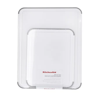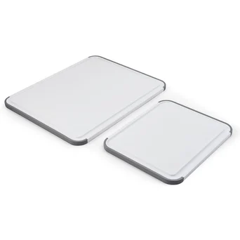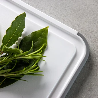 Komplet dwóch kuchennych desek do krojenia z rowkiem na płyny i antypoślizgowymi krawędziami .Wykonane z bezpiecznego tworzywa, które nie wchłania wilgoci oraz zapachów. Łagodne dla ostrzy noży. Można używać obustronnie i myć w zmywarce.