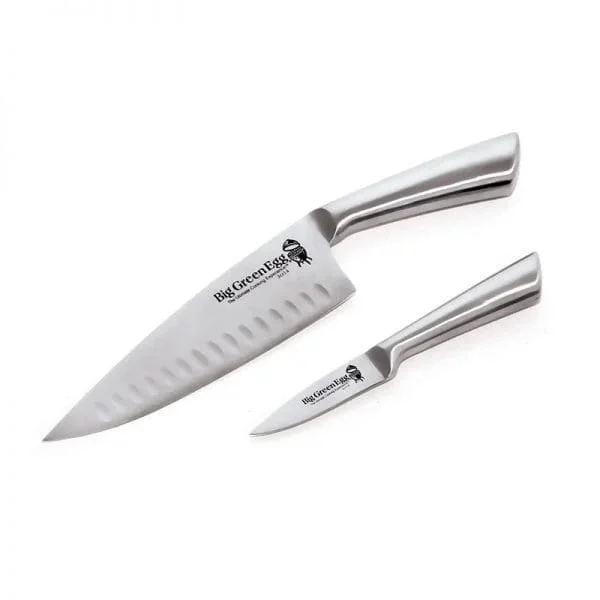 Zestaw dwóch noży kuchennych ze stali nierdzewnej (Knife Set Big Green Egg) został zaprojektowany przez szefów kuchni Big Green Egg z myślą o precyzji i komforcie codziennej pracy przy kamado. Zestaw obejmuje duży nóż szefa kuchni i mniejszy nóż do precyzyjnego krojenia – kompletne wyposażenie dla każdego, kto ceni jakość narzędzi kuchennych.