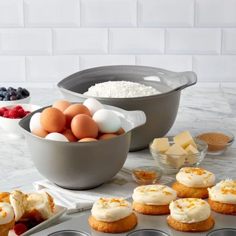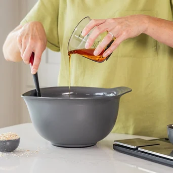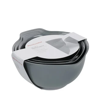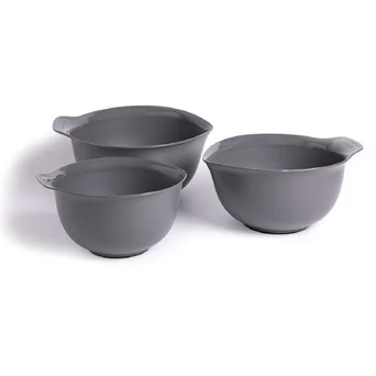 Komplet 3 dużych, wykonanych z tworzywa misek kuchennych, idealnych do mieszania, ubijania i przechowywania. Miski wyposażone są w wygodny uchwyt, dzióbek, pomocny przy przelewaniu oraz antypoślizgową podstawę, zapobiegającą przesuwaniu się po blacie podczas pracy. Miski łatwo się przechowuje (jedna w drugiej) i można je myć w zmywarce oraz używać w kuchence mikrofalowej (do 5 minut).