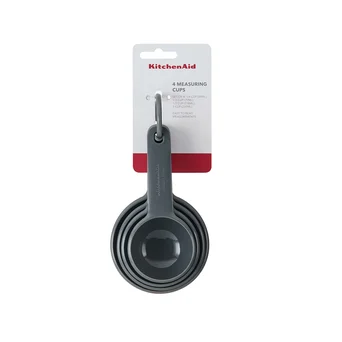 Zestaw miarek kuchennych w 4 rozmiarach z amerykańskim przelicznikiem miar (cups) do produktów suchych i mokrych. Uchwyty z oznaczeniem pojemności. Klips do wygodnego przechowywania miarek. Można myć w zmywarce (zalecana górna półka).